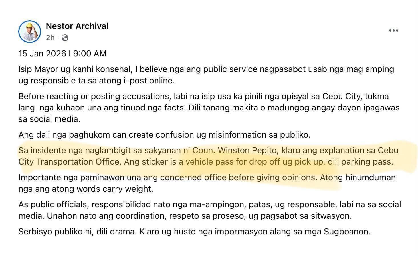 “As mayor and former councilor, I believe that public service also means being careful and responsible with what we post online,” Archival said in Cebuano.